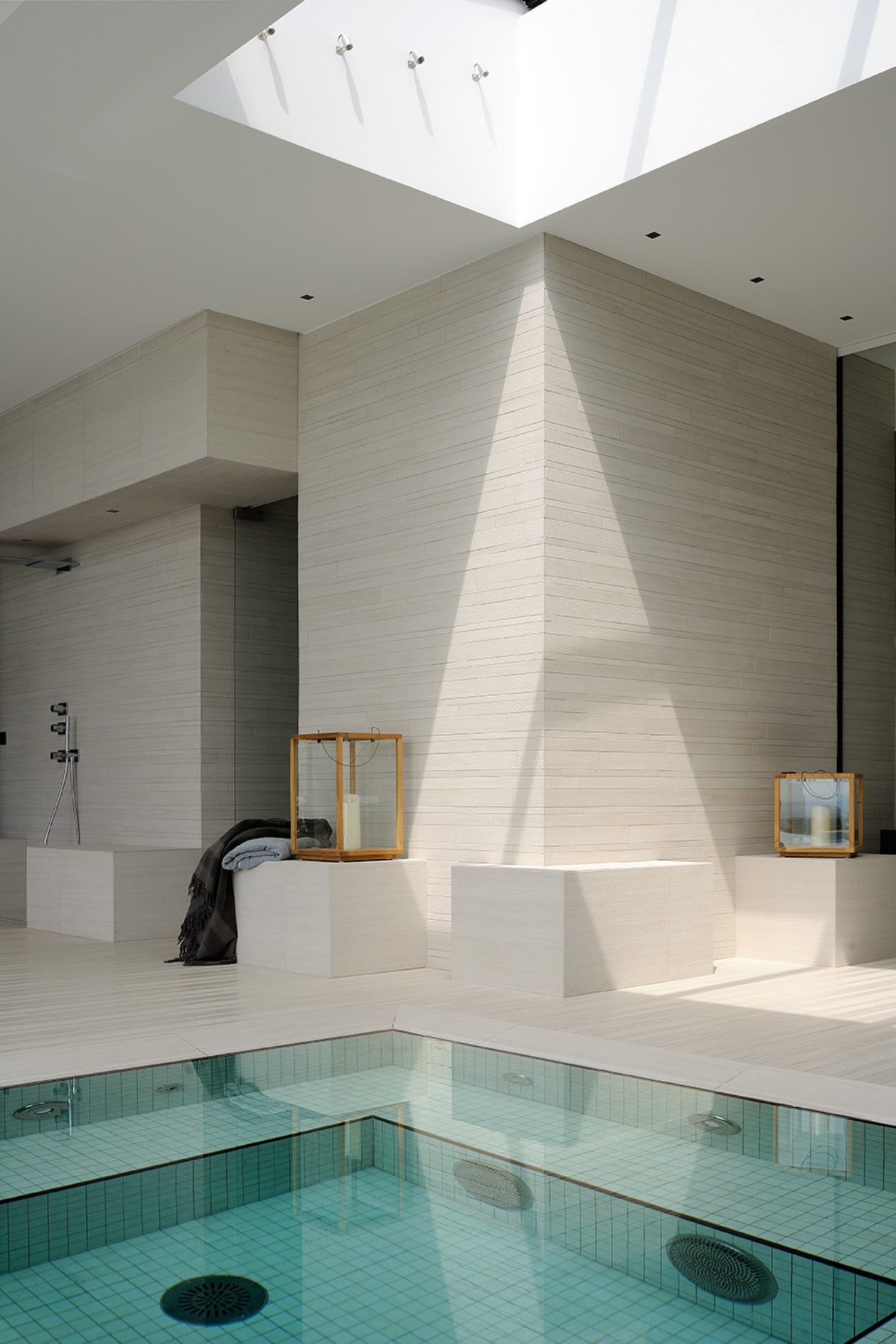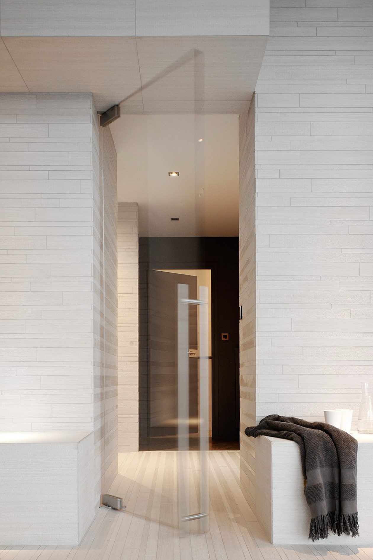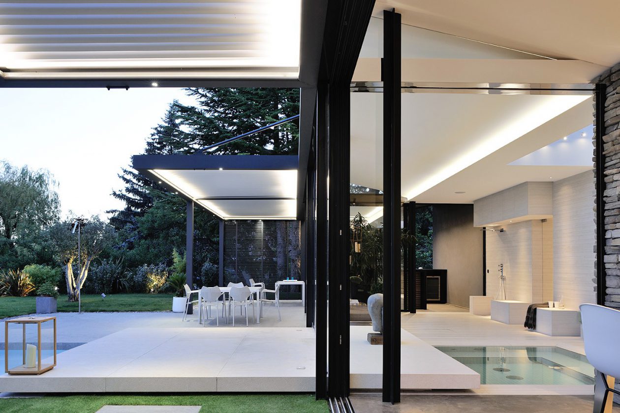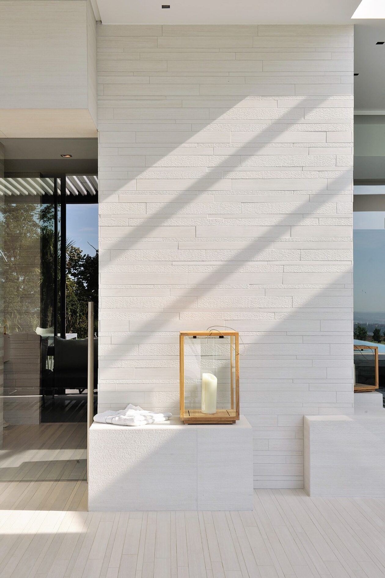 La surface structurée confère une continuité stylistique au projet résidentiel, avec des applications qui se succèdent de l’intérieur vers le grand espace extérieur.